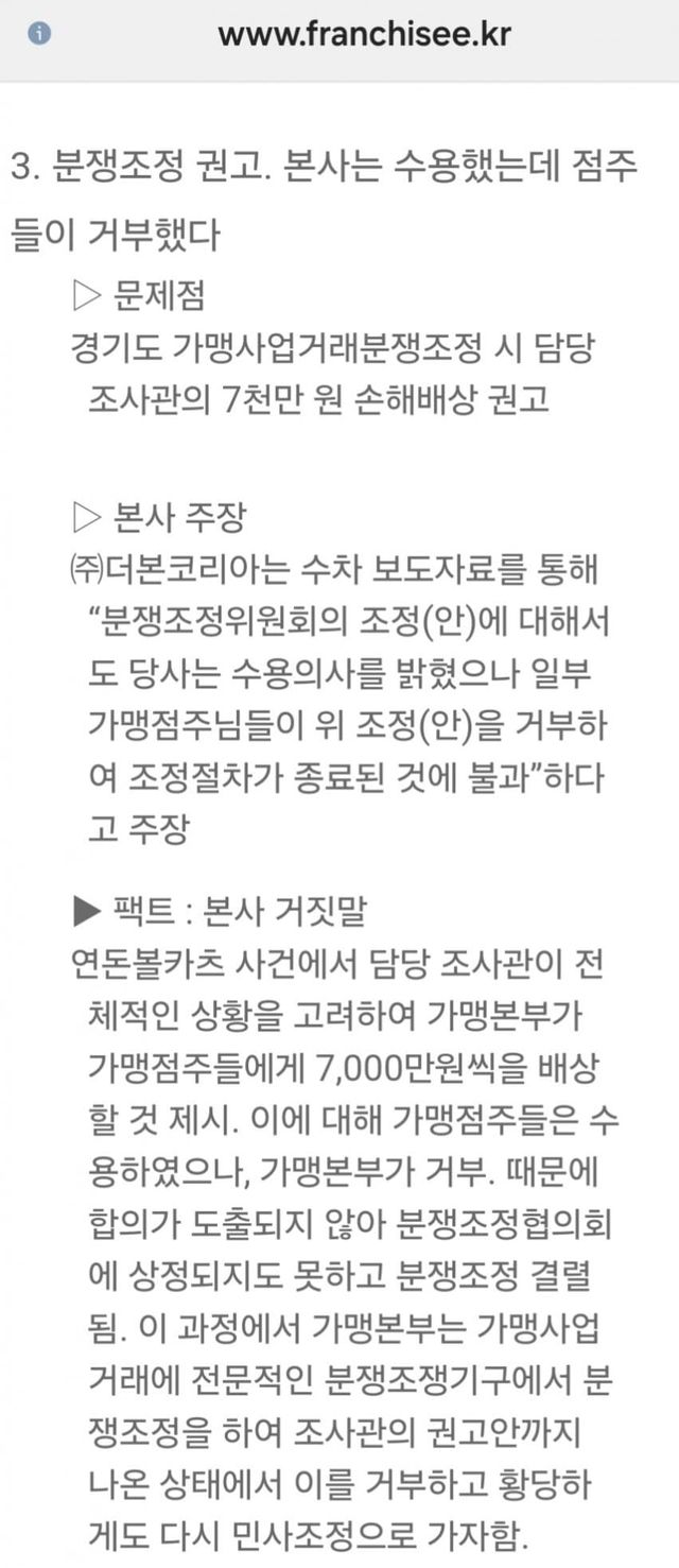 참고로 분쟁조정위원회에서 더본코리아가 각 볼카츠 점주들에게 7천만원씩 배상하라고 제시했는데