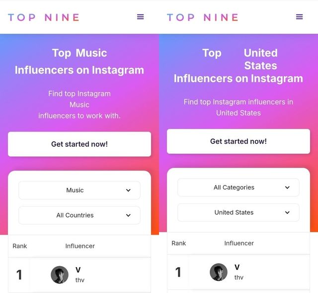 '톱 나인'에 따르면 뷔는 미국에서도 '가장 영향력 있는 인플루언서' 1위를 차지하며 막강한 영향력을 과시했다. 현재 6688만 명의 팔로워를 보유한 뷔의 인스타그램은 미국 팔로워가 1217만 명으로 가장 높은 비중을 차지하고 있다. 이는 K팝 스타 중 미국에서 가장 많은 팔로워를 확보한 기록이다. 뷔는 '전 세계에서 가장 영향력 있는 인플루언서 톱 1000'에서도 아시아 스타 중 최고 순위인 5위를 기록했다.