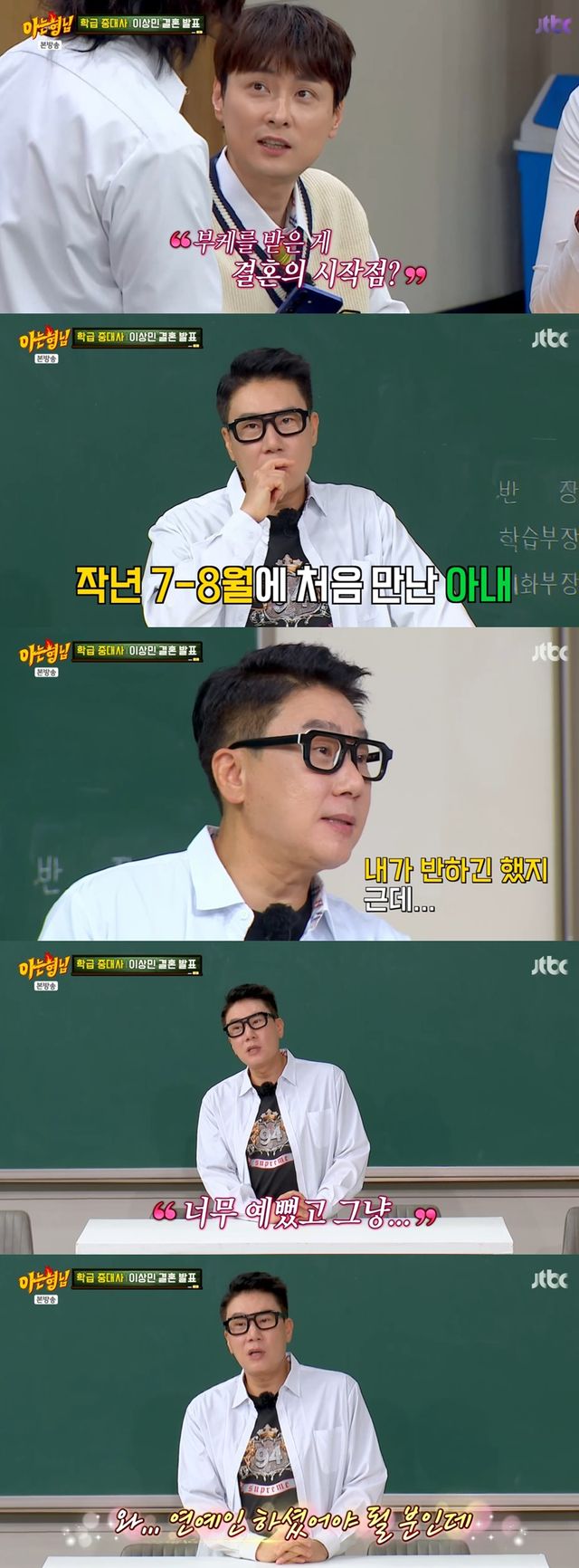 마침내 등장한 이상민은 축하의 박수를 받으며 결혼과 관련된 최초의 러브스토리를 공개했다. 아내와 언제 만났냐는 말에 그는 "작년 7-8월에 처음 만났다. 작년에는 아예 (얼굴만) 아는 사이였지 연락을 주고 받는 사이가 아니였다"고 운을 뗐다.