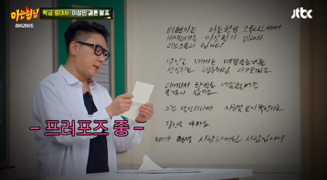 최근 이상민이 국제 커플 편에서 미래의 배우자에게 쓴 시도 사실 프로포즈였다고 밝혔다. 이상민은 “ 끝에 ‘기다립니다’고 넣었다. 당신의 답변과 마음을 기다린다는 거였다”며 “만난 기간이 3, 4개월 밖에 안되니까 매 순간이 촉박했다. 나는 그녀가 아니면 평생 결혼을 못할 것 같았다”고 고백했다.