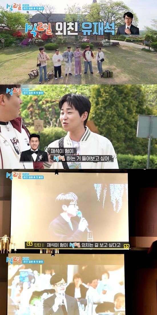 자료화면에는 실제 김종민의 결혼식에서 딘딘이 유재석에게 "재석이 형이 ‘1박 2일’ 외치는 걸 보고 싶다더라"며 부탁했다. 당시 유재석과 함께 '런닝맨'에 출연 중인 하하는 "하지 마!"라며 말렸지만, 유재석은 웃으며 "'1박 2일!'"을 외쳤다.