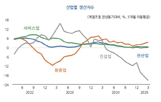 국내 상황으로는 건설업 부진이 이어지며 내수 회복을 지연시키는 요인으로 작용하고 있다. 3월 전산업생산(1.2%→1.3%)은 건설업의 부진(-20.2%→-14.7%)이 지속되며 전월과 유사한 낮은 증가율을 기록했다.