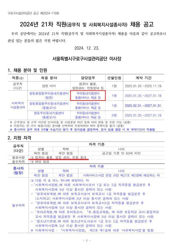 이에 대해 서울특별시구로구시설관리공단 측은 “기사에서 인용된 채용공고 상 ‘컴퓨터 활용, 일정 관리, 민원 응대’ 등의 직무 내용은 해당 직군이 아닌 다른 채용 직군에 대한 내용이며, 해당 사안은 고용노동부로부터 과태료나 제재 없이 단순한 ‘행정지도’로 종결됐다”고 알려왔습니다.