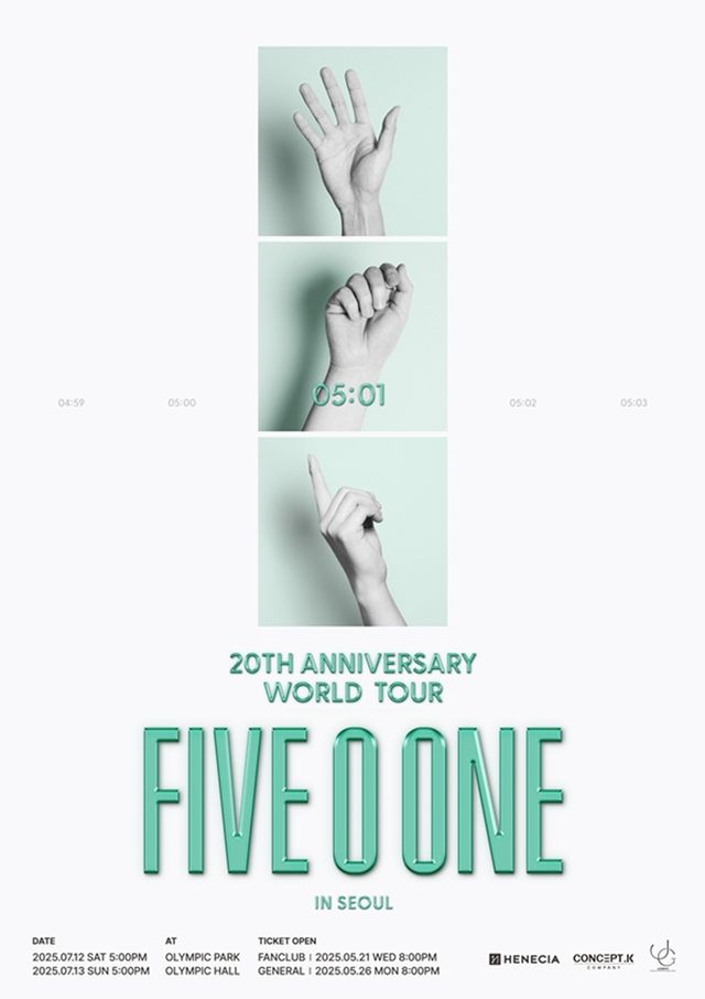 13일 헤네치아는 "FIVE O ONE이 오는 7월 12일과 13일 양일간 서울 올림픽공원 올림픽홀에서 '2025 FIVE O ONE : 20th Anniversary World Tour In Seoul'을 개최한다. 월드 투어의 첫 시작이 될 이번 공연에서 오랜 시간을 기다린 팬들에게 보내는 세 사람의 아름다운 하모니가 감동을 선사할 예정이다"고 전했다.