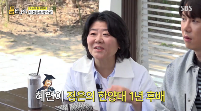 유재석이 “누나가 고학력자시네. 영어 잘하지 않냐”고 반응하며 또다른 한양대 출신인 조혜련을 언급했다. 그러자 이정은은 “조혜련이 1년 후배다. 나는 그분이 개그우먼이 될 줄 알았다. 그때도 ‘전국 노래자랑’ 등 예능이 있으면 다 나가려고 했다”며 “언젠가는 분명히 성공할 줄 알았다”고 말했다.
