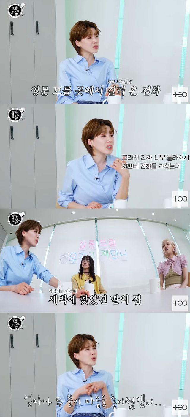 장도연은 "밤 한 11시인가 넘어서 광진구 무슨 센터라고 하더라. 저는 광진구에 살지도 않을뿐더라 부모님은 인천에 계신다. 전화로 딸이 어쩌고저쩌고 했나 보더라. 너무 놀라셔서 저한테 전화를 하셨는데 자고 있어서 못 받았다"며 "그 새벽에 저희 집에 오셨다"고 전했다.