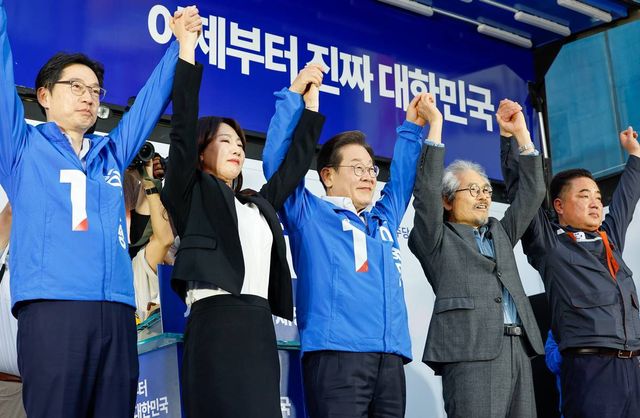이재명 더불어민주당 대통령 후보가 지난 14일 오후 경남 거제시 엠파크 차없는 거리를 찾아 김경수 공동선대위원장, 한화오션 조립4팀 신승훈 씨 등과 손을 맞잡아 들고 있다 / 뉴스1