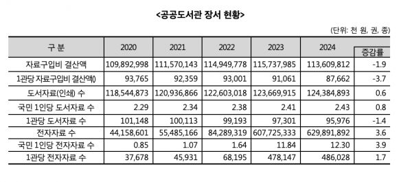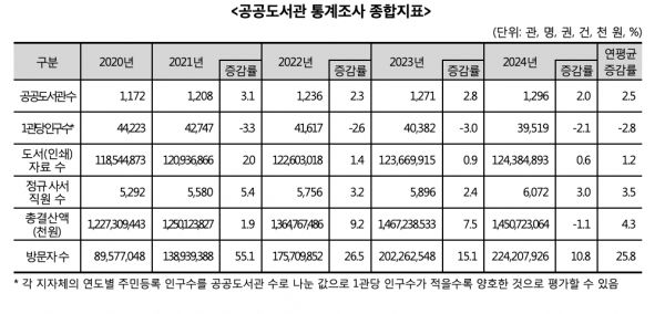 문화체육관광부(이하 문체부)가 한국도서관협회와 함께 ‘2025년 전국 공공도서관 통계조사(2024년 실적 기준)’ 결과를 발표했다.