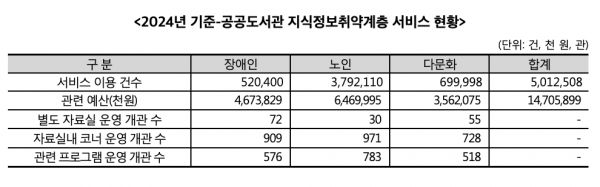 올해는 공공도서관의 사회적 포용성과 역할을 더욱 정밀하게 파악하기 위해 지식정보취약계층을 장애인, 노인, 다문화가족 등 3개 그룹으로 세분화한 지표를 처음 도입했다. 공공도서관은 지식정보취약계층을 대상으로 500만 건 이상의 서비스를 제공하고 있으며, 관련 예산 규모는 총 140억 원을 넘어섰다. 또한 공공도서관이 세대와 계층의 구별 없이 자유롭게 이용할 수 있도록 열린 공간으로 변화하고, 무장애(배리어 프리) 시설 인증에 따라 별도 자료실을 두기보다 건물 전체를 지식정보취약계층에 친화적인 환경으로 만드는 추세를 보였다.