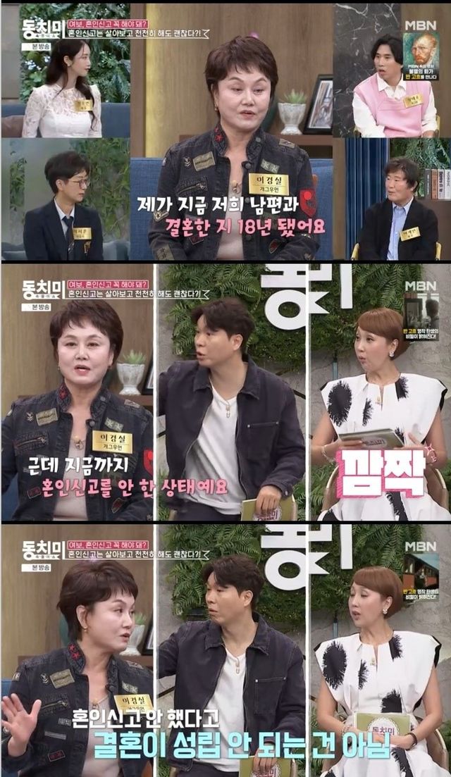이경실은 지난해 방송된 MBN '속풀이쇼 동치미'에서 "재혼한지 18년이 됐지만 지금까지 혼인신고를 안 했다. 그렇다고 해서 결혼이 아닌 건 아니지 않나. 인생사를 돌아봤을 때 시끌벅적한 일이 몇 번 있었다. 첫 번째 이혼에 많은 분이 충격을 받았겠지만 가장 먼저 충격을 받은 건 나다. 가장 큰 트라우마가 됐다. 재혼도 쉽게 생각한 건 아니지만 혼인신고라는 게 나한텐 큰일이었다"고 이야기했다.