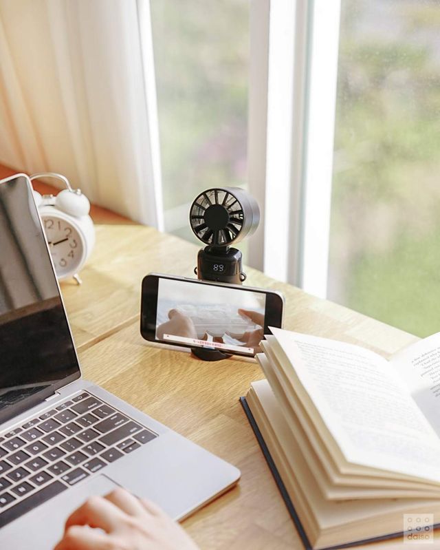 핸디형 겸용 제품은 휴대성을 강화한 형태로, 필요할 때 손에 들고 다닐 수 있고 스탠드로도 사용할 수 있다. 제품 하단은 스마트폰 거치대로도 활용할 수 있어 책상 위에서 다용도로 쓰인다. 풍량은 총 3단계로 조절 가능하며, 배터리 충전 후 1단 풍속 기준 약 3시간 이상 사용 가능하다. 배터리 잔량은 LED로 확인할 수 있어 실용성도 높다.