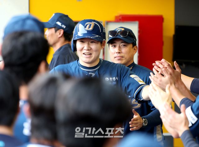 2025 KB0리그 프로야구 SSG랜더스와 NC다이노스의 경기가 13일 오후 인천SSG랜더스필드에서 열렸다. 1회초 2사 1루 박건우의 적시 2루타에 득점한 박민우가 동료들의 축하를 받고 있다. 인천=김민규 기자 mgkim1@edaily.co.kr /2025.05.13/