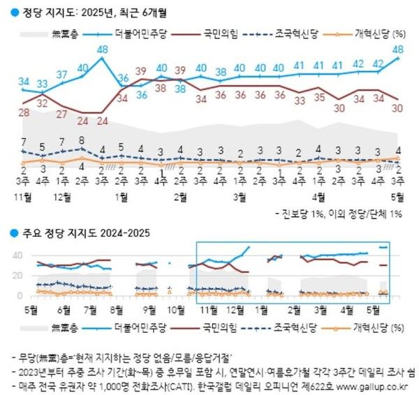 뉴시스 보도에 따르면, 한국갤럽이 지난 13~15일 전국 18세 이상 1004명을 대상으로 실시한 정당지지도 조사에 따르면 민주당은 48%, 국민의힘은 30%로 나타났다.