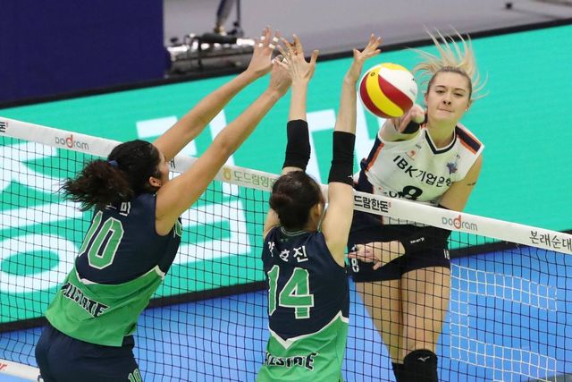 2021년 경기도 수원시 장안구 수원실내체육관에서 열린 프로배구 '2021-22시즌 도드람 V리그' 여자부 현대건설과 기업은행의 경기에서 기업은행 라셈이 공격을 하고 있다 / 뉴스1