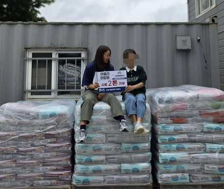 사진 속 이효리는 보호소 관계자와 ‘이효리·이상순, 사료 2톤 기부’라는 플래카드를 들고 사료 포대 위에 앉아 미소 지었다.