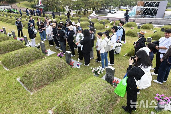 뉴시스 보도에 따르면, 신록을 배경으로 우뚝 솟은 수백여기 회색 묘비들 사이로 민주영령들을 기리러 온 발걸음이 이어졌다.