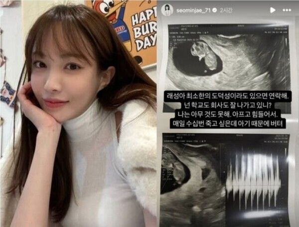 서민재는 어제(17일) 자신의 인스타그램 스토리에 "매일 수십 번 죽고 싶은데 아기 때문에 버텨"라며 극심한 고통을 호소하는 글을 게재했다. 그러면서 "최소한의 도덕성이라도 있으면 연락해"라고 덧붙이며 아이의 아빠에게 직접적인 연락을 촉구했다.