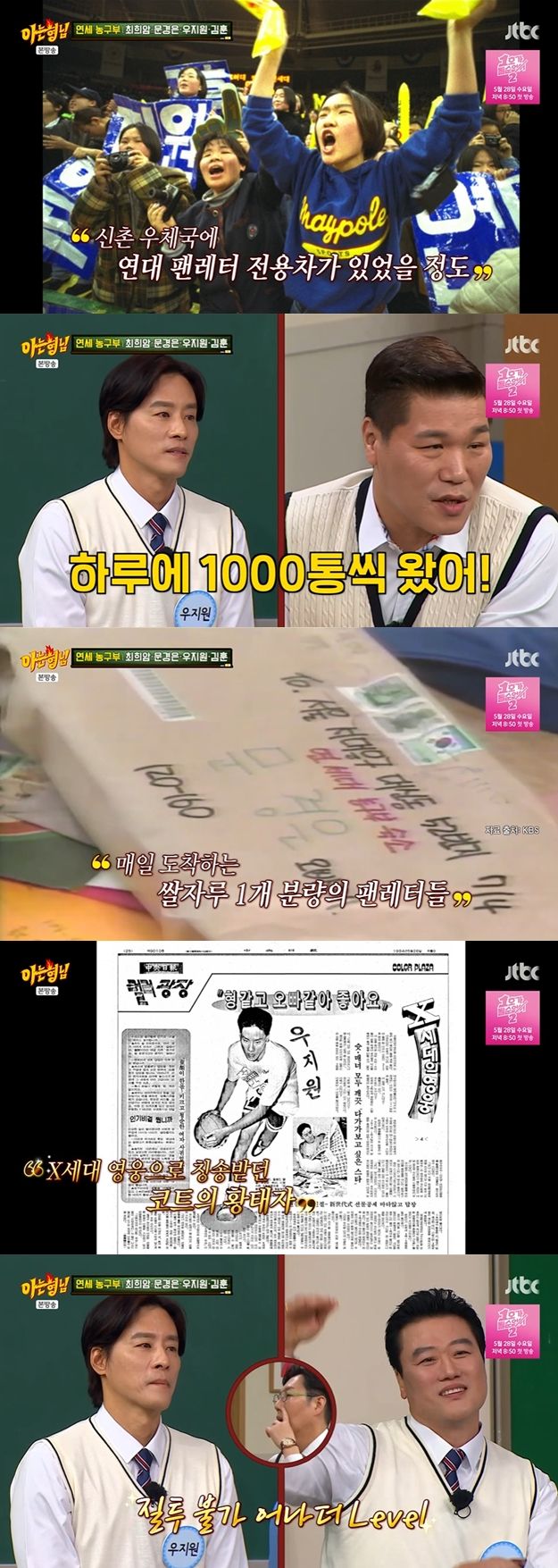 우지원은 "연대 농구부 전용 차가 있을 정도로 편지가 엄청나게 왔다. 장훈이가 1학년 때 많이 나누고 정리했다"라며 말하자, 서장훈은 "매일 1,000통씩 왔다. 쌀 한 자루씩 왔다. 그중에 반은 지원이한테  온거다. 다른 사람들도 웬만큼 왔고 나는 진짜 별로 없었다"라고 말해 웃음을 안겼다.
