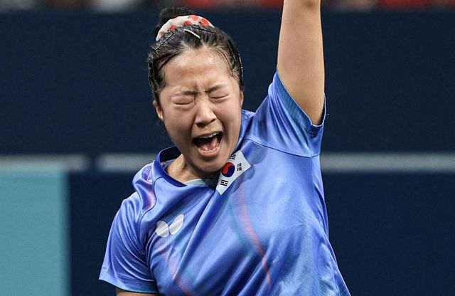 대한민국 탁구 대표팀 신유빈 선수가 2024년 8월 1일 오전(한국시간) 프랑스 파리 사우스 파리 아레나 4에서 열린 '2024 파리올림픽' 탁구 여자 단식 16강 미국의 릴리 장 선수와의 경기에서 기뻐하고 있다. 기사와 무관 / 뉴스1