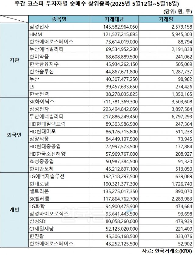 기관 '삼성전자'·외인 'SK하이닉스'·개인 'LG에너지솔루션' 1위 [주간 코스피 순매수- 2025년 5월12일~5월16일]