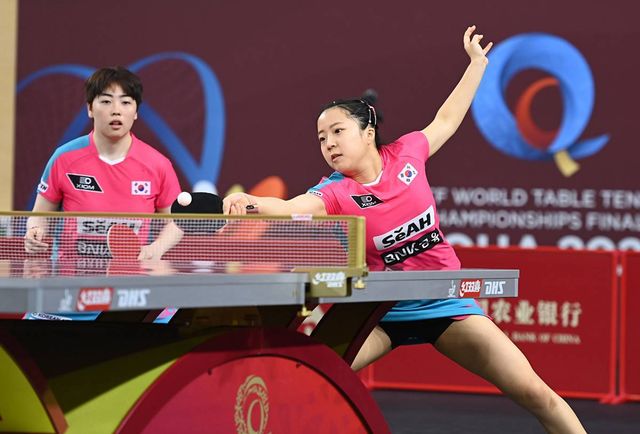 신유빈, 유한나가 지난 19일 카타르 도하 카타르대학교 스포츠 컴플렉스에서 열린 2025 국제탁구연맹(ITTF) 세계선수권대회 여자복식 32강 조르지나 포타(헝가리), 드 누트(룩셈부르크) 조와 경기를 펼치고 있다 / 뉴스1