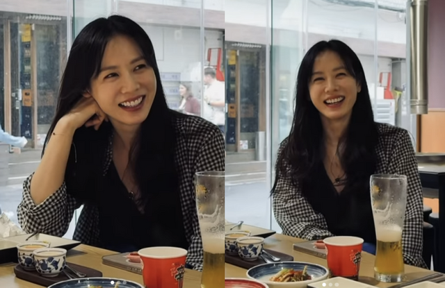 영상에는 한 식당에서 밝게 웃으며 맞은편 카메라를 바라보는 손예진의 모습이 담겼다. 지인들과 한창 식사 중인 것으로 보이는 손예진은 컵라면과 생맥주 등을 먹으며 행복한 한때를 보내는 모습이다.
