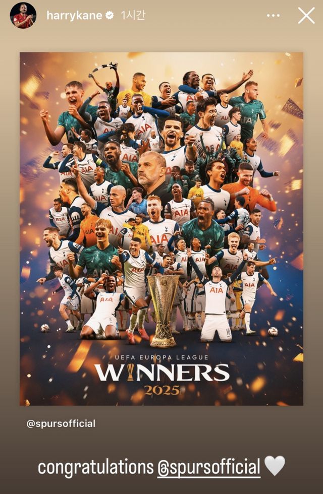 케인 역시 “축하해, 토트넘”이란 글과 함께 토트넘의 공식 우승 포스터를 올렸다.