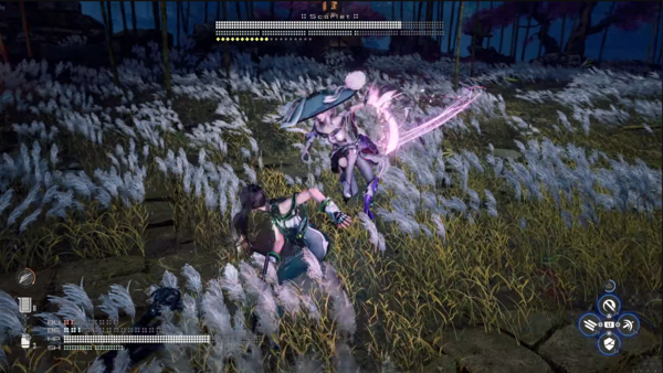 ‘홍련’과의 전투는 대나무와 갈대가 우거진 새로운 맵 안에서 펼쳐지며, 화면 전체를 뒤덮는 강력한 패턴을 포함한 다양한 검술 패턴으로 주인공 이브를 압박한다.