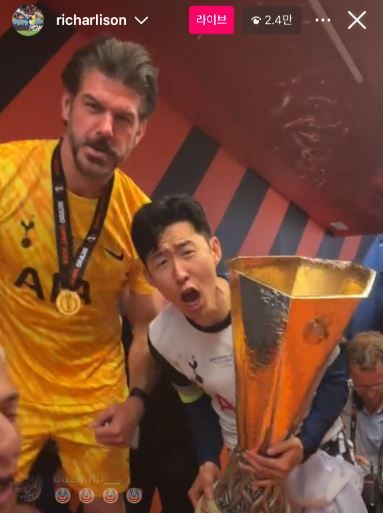 이날 선발 출전해 손흥민과 교체되기 직전까지 활약한 히샬리송이 우승 세리머니 이후 라커룸에서 인스타그램 라이브를 통해 동료들과 함께 축하하는 모습을 생중계했는데, 손흥민 또한 포착된 것이다.