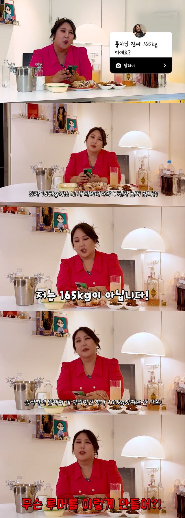 이에 거친 말을 내뱉은 그는 "진짜 165kg면 내 차 타이어 4짝 무게를 넘지 않나"라고 짚으며 "전 1654kg가 아니다. 솔직하게 말해서 세 자리이긴 하나 160kg까지 안 간다. 무슨 루머를 이렇게 만드냐"라고 솔직히 답해 웃음을 자아냈다.
