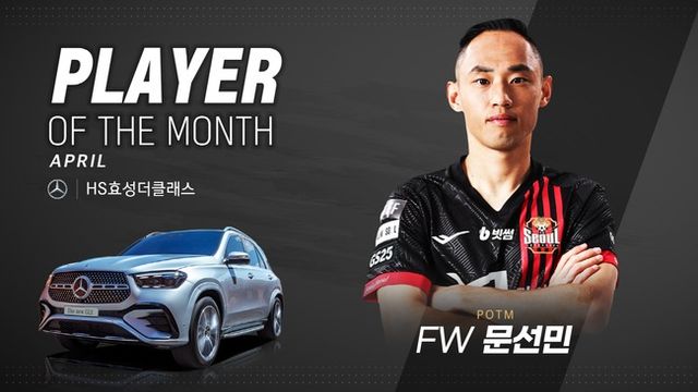 4월의 선수상을 수상한 문선민에게는 FC서울의 공식 스폰서 메르세데스-벤츠 공식 딜러 HS효성더클래스에서 GLE 450 4MATIC 차량이 제공된다. GLE는 베스트셀링 모델로 고급스러운 디자인, 강력한 성능, SUV 특유의 높은 실용성, 넉넉한 실내 공간 등을 두루 갖춘 것이 특징이다. 높은 인기에 힘입어 지난 4월 신규 가솔린 트림 ‘GLE 350 4MATIC’도 라인업에 추가됐다.