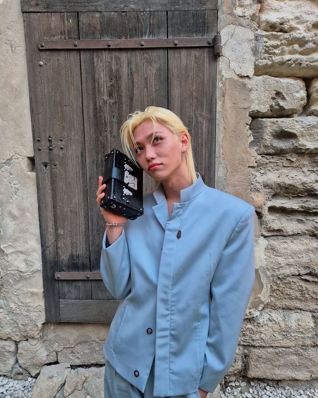 포인트 아이템도 빼놓을 수 없죠. 필릭스는 루이 비통이 그를 위해 커스텀한 쁘띠뜨 말 핸드백을 들고 등장했어요. 클래식한 모노그램 검정 패턴 위에 큐빅 장식이 더해져 필릭스의 룩을 더 고급스럽게 완성시켰습니다. 이어진 오프샷에서는 핸드백을 귀에 대고 전화받는 듯한 장난기 가득한 포즈를 보이며 팬들을 웃음 짓게 만들었네요.