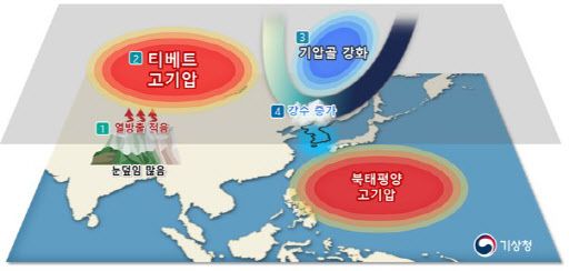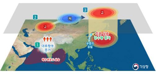 열대 서태평양과 북인도양의 높은 해수면 온도는 대기 중으로 많은 수증기를 공급하고, 우리나라 쪽으로 대기 파동을 일으켜 한반도 남동쪽에 고기압성 순환을 강화시킨다. 이에 따라 우리나라에는 남쪽의 고온다습한 공기가 유입돼 평소보다 덥고 강수량이 늘어날 수 있다. 유럽의 적은 눈 덮힘과 북극 해빙의 감소도 우리나라로 향하는 대기 흐름을 도와 고기압성 순환과 기온 상승을 부추길 수 있다.
