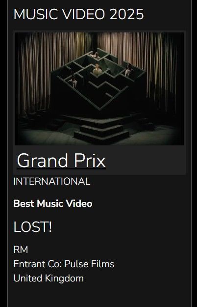 글로벌 슈퍼 그룹 '방탄소년단'(BTS) 리더 RM(김남준)이 지난해 5월24일 발매한 솔로 2집 '라이트 플레이스, 롱 퍼슨(Right Place, Wrong Person)' 타이틀곡 '로스트(LOST)!' 뮤직비디오가 공개 1년이 지난 지금도 해외 유명 영상 시상식에서 여전히 낭보를 전하고 있다.