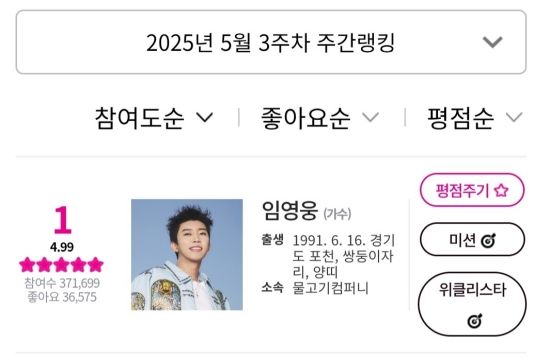 아이돌차트에 따르면, 지난 5월 16일부터 5월 22일까지 집계된 평점랭킹에서 임영웅은 371,699표를 얻어 최다득표를 기록했다.