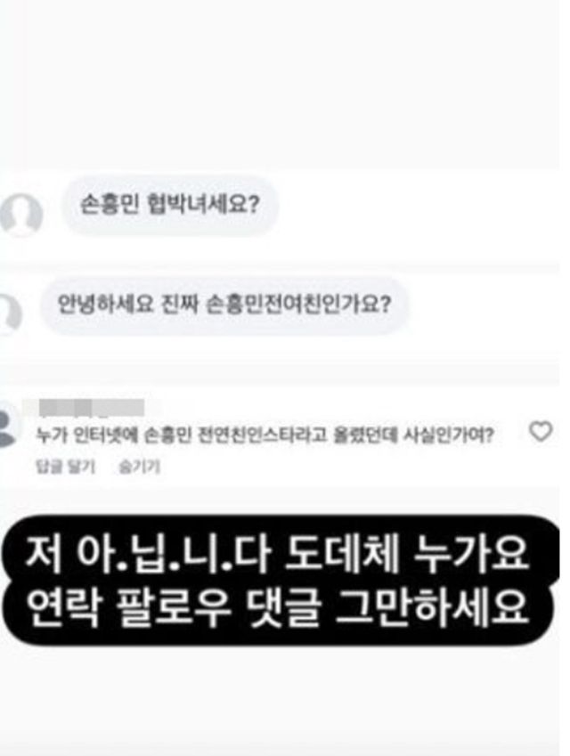 정민희가 올린 글에는 그가 받은 DM(다이렉트 메시지)의 내용이 공개돼있다. 해당 DM에는 ‘손흥민 협박녀세요?’ ‘진짜 손흥민 전여친인가요?’ ‘누가 인터넷에 손흥민 전여친 인스타라고 올렸던데 사실인가요?’라는 질문이 이어지고 있다.