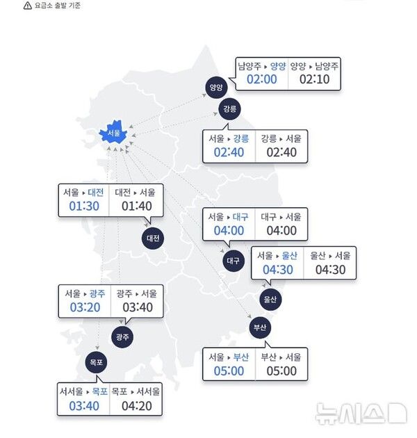 상행선은 ▲부산~서울 5시간 ▲대구~서울 4시간 ▲광주~서울 3시간40분 ▲대전~서울 1시간40분 ▲강릉~서울 2시간40분 ▲울산~서울 4시간30분 ▲목포~서울 4시간20분이다.