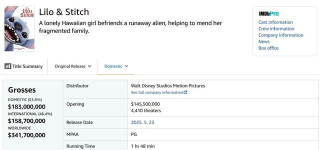 현재까지 ‘릴로 & 스티치’의 전 세계 누적 수익은 3억 4,170만 달러(한화 약 4677억 원)이다.