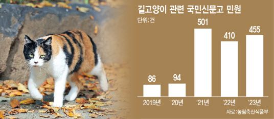 그럼에도 길고양이에 대한 민원은 계속해서 늘어나고 있다. 길고양이 관련 국민신문고 민원 건수는 2019년 86건에서 2020년 94건, 2021년 501건, 2022년 410건, 2023년 455건 등이 접수됐다.