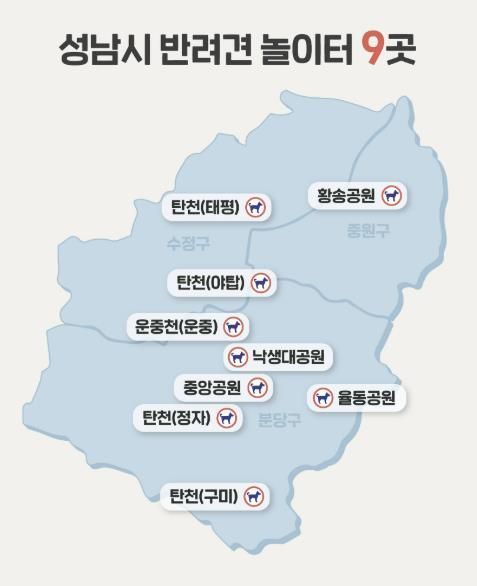 기존에 운영 중인 반려견 놀이터는 △황송공원 △중앙공원 △율동공원 △탄천 태평 수진쉼터 인근 △탄천 야탑 사송교 인근 △탄천 정자 궁내교 인근 △탄천 구미 물놀이장 인근 △삼평동 운중천에 있다.