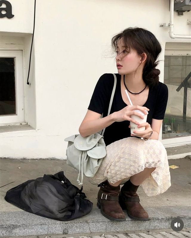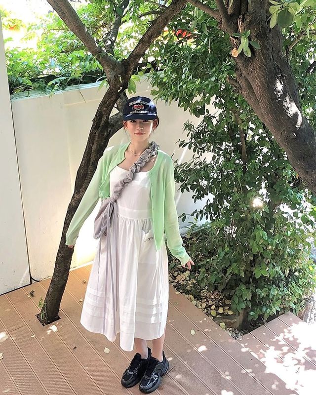 그녀의 스타일링 포인트는 다양한 아이템의 믹스매치와 레이어링에 있다. 박시한 화이트 원피스에 청바지 또는 파스텔 카디건을 레이어드한 게 좋은 예. 그외에도 볼드한 형태감의 슈즈와 볼캡 등 캐주얼한 아이템과의 믹스매치도 능숙하다. 여러가지 아이템을 조합하고 싶다면 그녀의 sns가 좋은 예시가 되어줄 듯!
