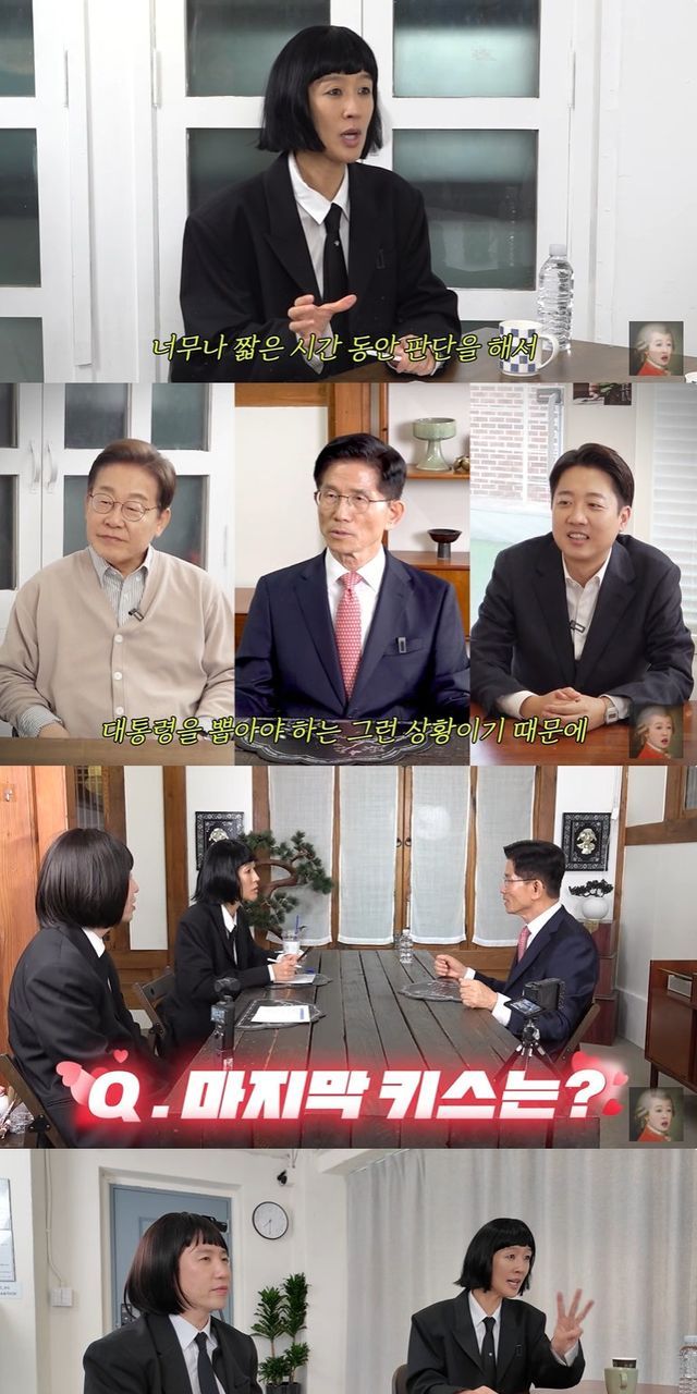 "마지막 키스는"이라는 홍진경의 질문에 이재명 후보는 "그걸 누가 가르쳐주냐"고 답했고, 김문수 후보는 "키스는 뭐 요즘도 매일 하지"라고 답한 반면 이준석 후보는 웃기만 했다.