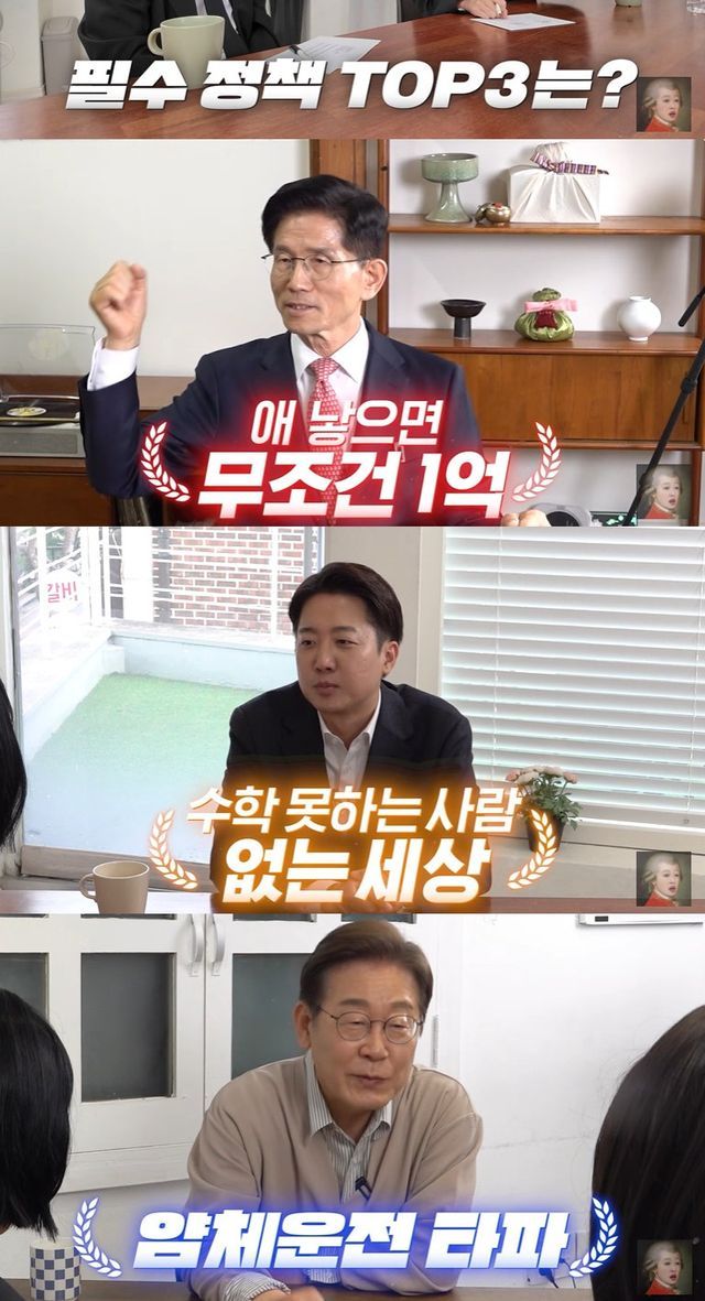 이어 홍진경은 "내가 대통령이 된다면 하고 싶은 정책 딱 3가지"라고 물었고, 김문석 후보는 "아이 낳으면 무조건 1억씩", 이준석 후보는 "수학 못 하는 사람이 없었으면 좋겠다", 이재명 후보는 "유턴을 이렇게 해야 되는데 빨리 돌겠다고 여기서 기다린다"며 '얌체 운전 타파'를 꼽았다.