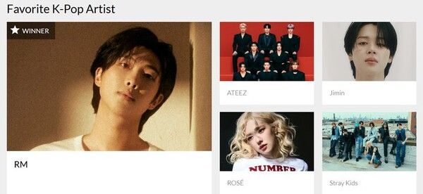 뉴시스 보도에 따르면, 26일(현지시간) 미국 라스베이거스에서 열린 올해 시상식에서 RM은 팀 동료인 지민, '아파트' 열풍을 일으킨 K팝 간판 걸그룹 '블랙핑크' 멤버 로제, 대세 그룹들인 '스트레이 키즈'(스키즈) '에이티즈'를 제치고 '페이버릿 K팝 아티스트' 부문을 받았다.