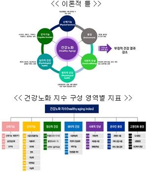 이번에 개발된 건강노화 지수는 신체기능, 인지기능, 심리적 건강, 생리적 건강, 사회적 안녕, 온라인 환경, 고령친화환경 등 7개 영역의 26개 지표로 구성됐다.
