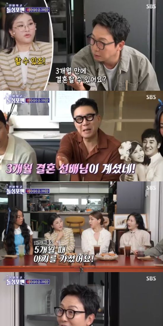 그러자 탁재훈은 "결혼하신 분들께 여쭤보고 싶다. 3개월만 만나도 결혼을 할 수 있냐"고 물었다. 윤혜진은 "저도 (엄태웅과) 3개월만에 결혼했다"고 했고, 강레오와 결혼한 박선주는 "저희도 연애 5개월만에 아이가 생겼다"고 말했다. 이를 들은 탁재훈은 "뭐야? 트렌드야?"라고 말해 웃음을 자아냈다.