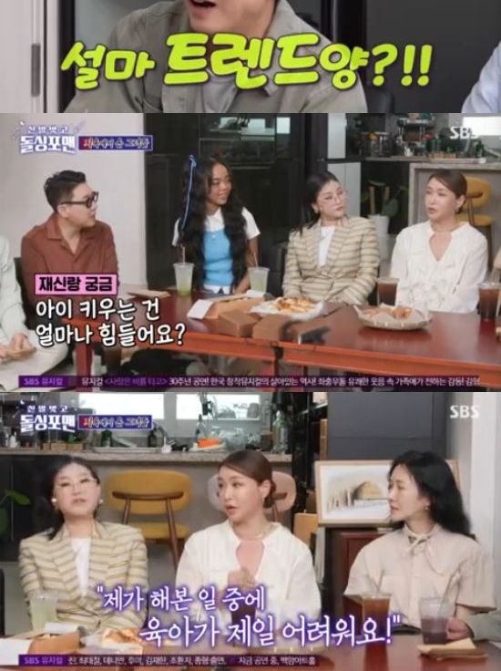 배윤정은 "남편들에게는 미안하지만 밖에서 일하는 게 더 쉽게 느껴진다. 하루종일 아기랑 있으면 바보가 되는 느낌이야. 몸의 변화도 너무 힘들다"면서 고충을 토로했다.