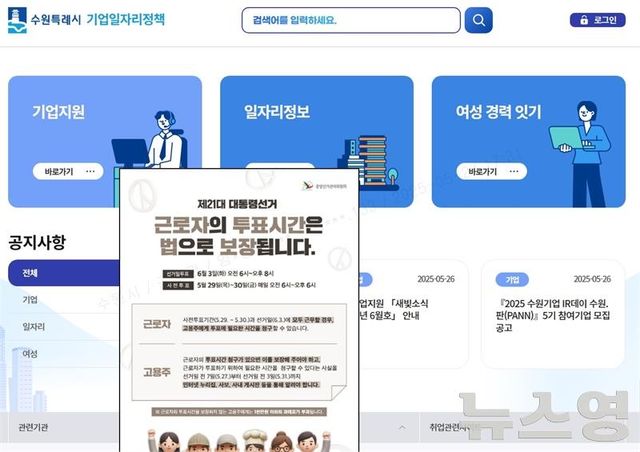 (뉴스영 이현정 기자) 수원시가 제21대 대통령 선거를 앞두고, 관내 1100여 개 기업에 ‘근로자의 투표 시간을 보장해 달라’는 내용의 홍보문을 발송했다.