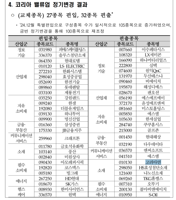밸류업 지수는 지난해 12월 특별편입으로 구성 종목 수가 일시적으로 105종목으로 증가했지만, 이번 정기 변경으로 100종목으로 재조정했다.