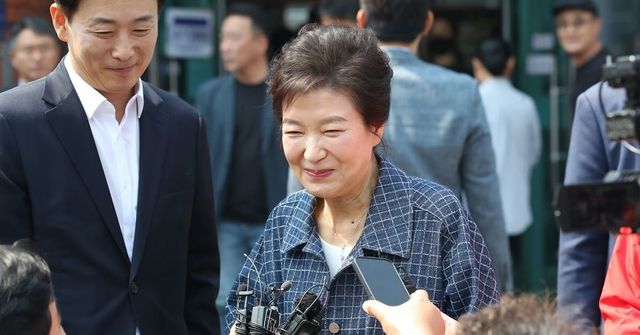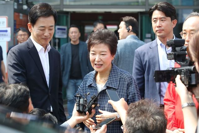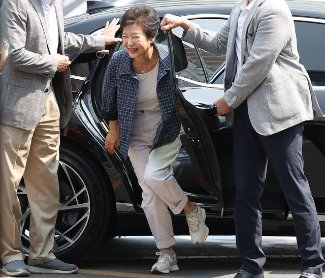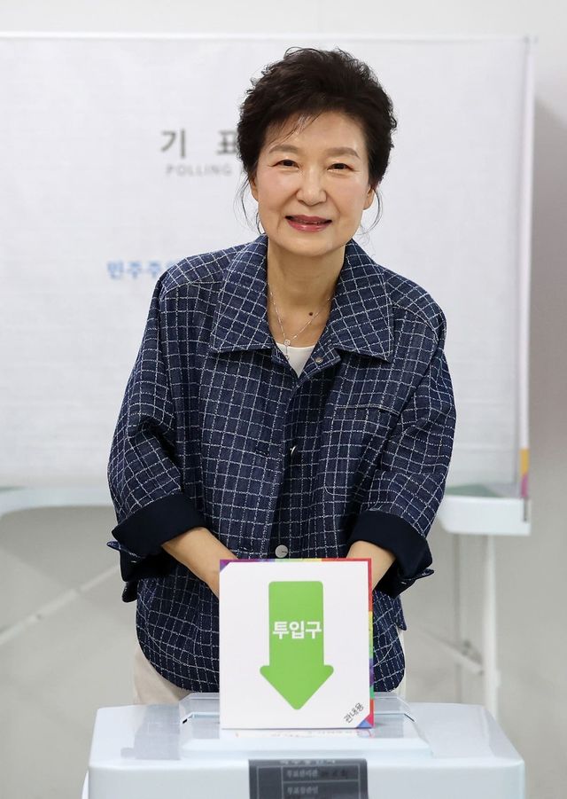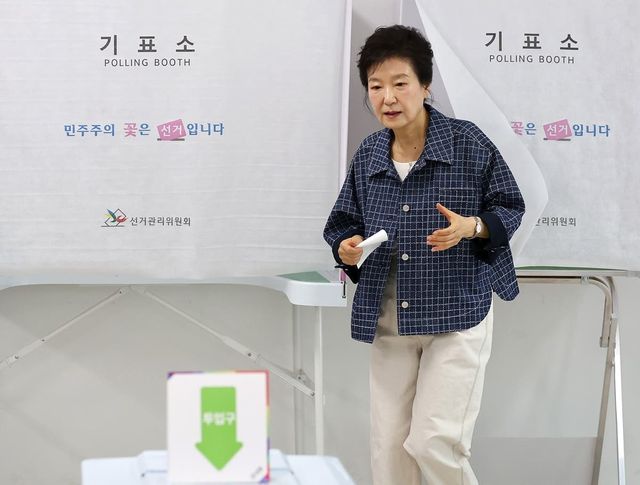 박 전 대통령은 이날 파란색 체크무늬 재킷에 흰색 바지와 흰색 운동화를 신고 투표소에 모습을 드러냈다.